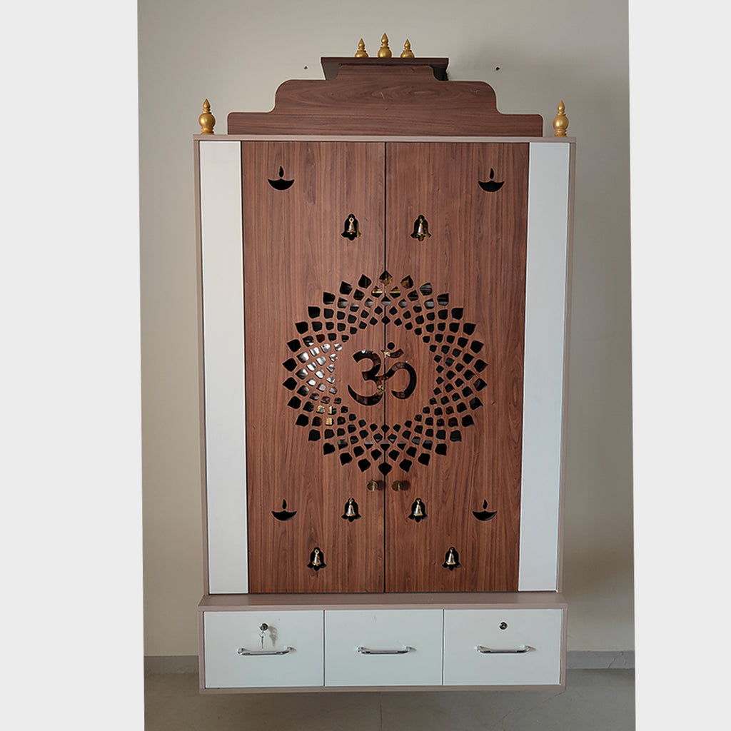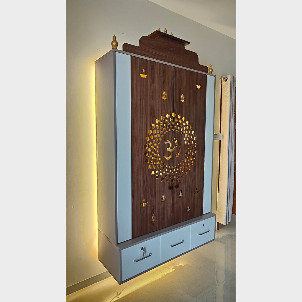 - It has carefully planned shelves, drawers, and sections to contain sacred objects, idols, and necessities like lamps and incense holders.
