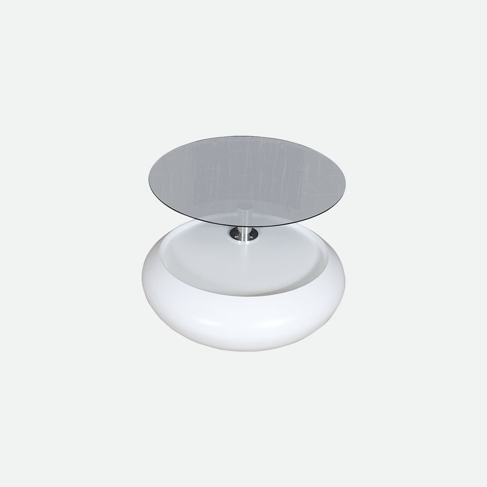 - The table's beautifully sculpted white shiny base with contrasting black support supports a clear circular glass top, giving it an attractive and stylish look.