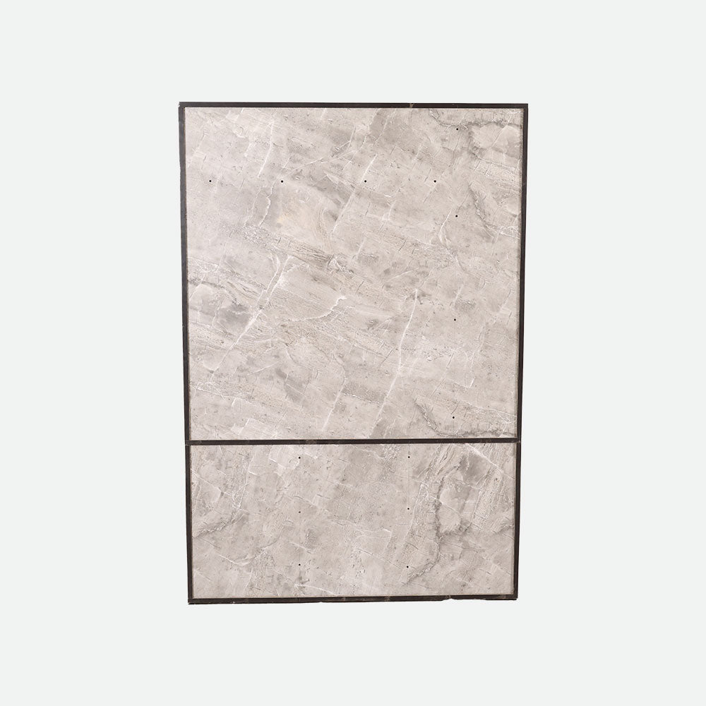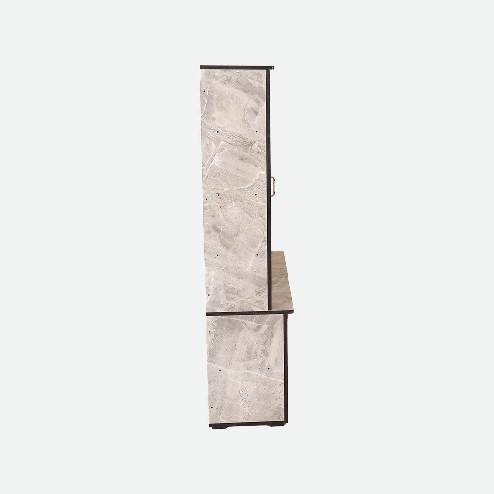 - Its elegant grey marble finish design blends well with modern decor and provides plenty of storage space with cabinets, open shelves, and a drawer.