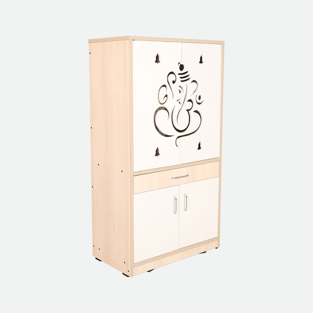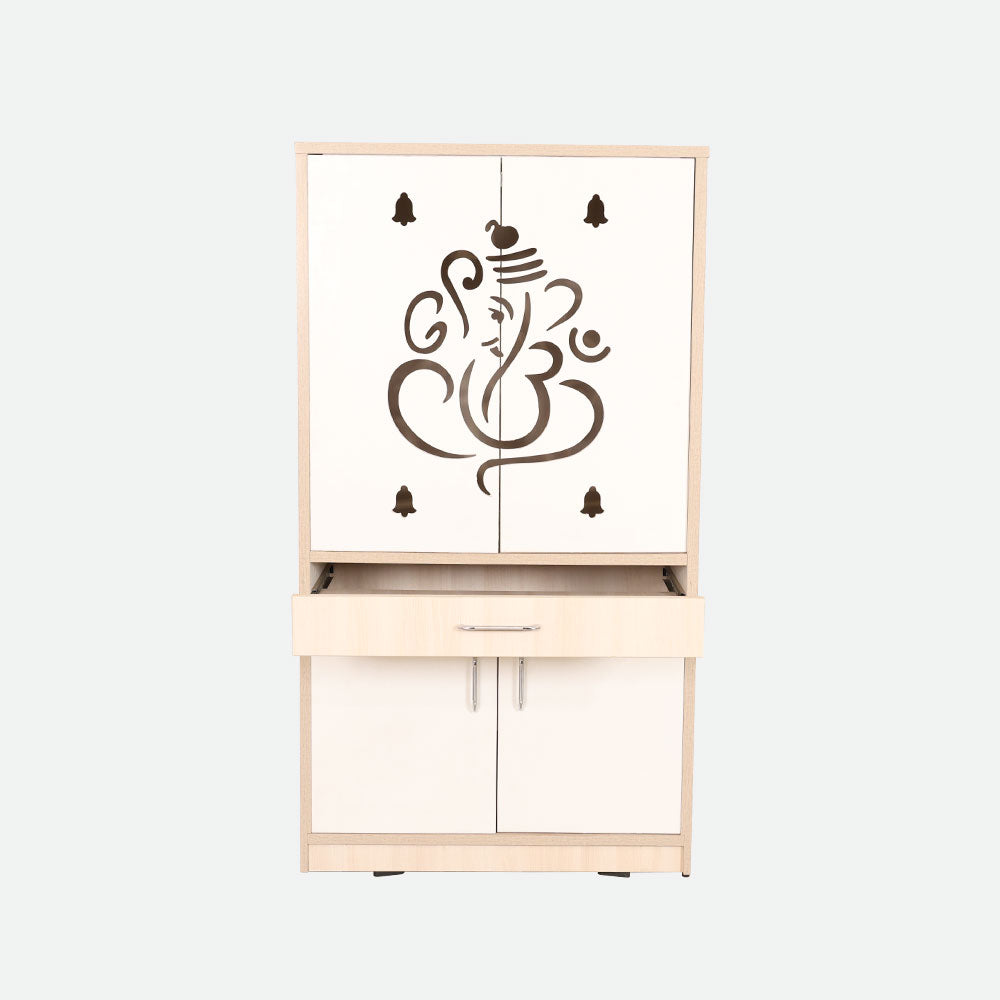 - Featuring intricate CNC-cut patterns on its sliding doors, this pooja rack blends tradition with modern aesthetics.