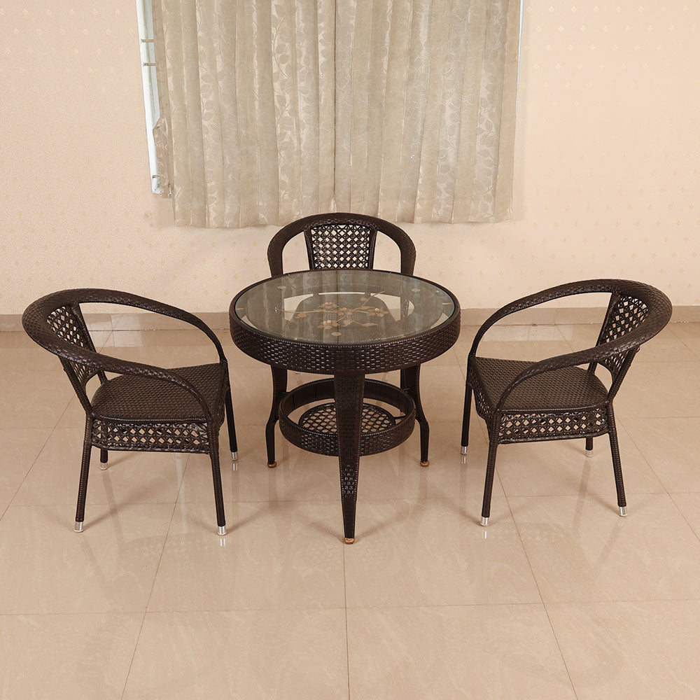 - This elegant set, which is designed for both practicality and beauty, comes with a round glass-top table and three matching seats.