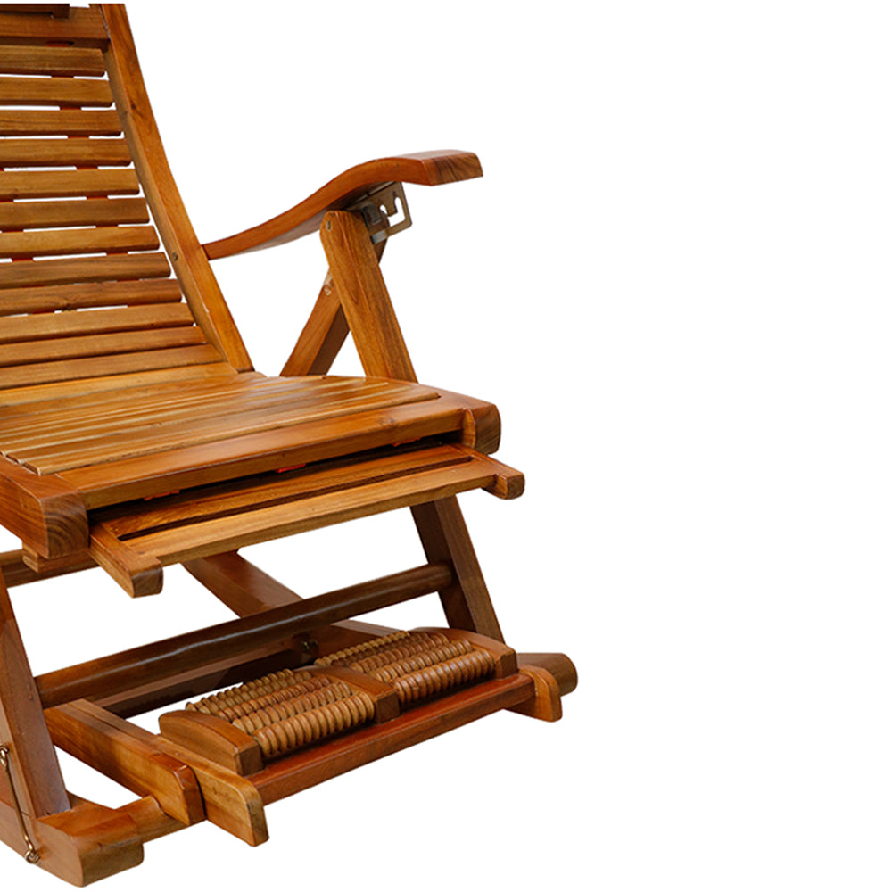 - This recliner chair is made of durable teak wood and features a beautiful natural finish that highlights the beauty of the wood grain.