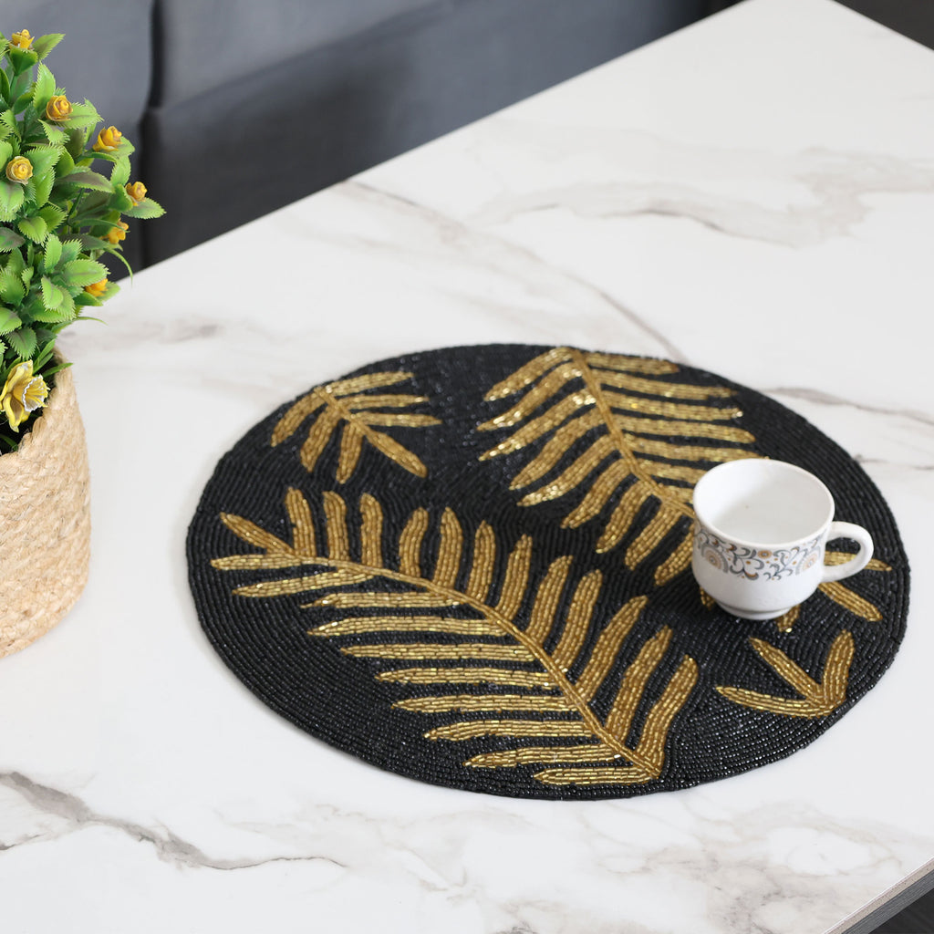 - The MAARK Beaded Table Mat in black with a gorgeous gold leaf design will add a touch of refinement to your dining or coffee table.