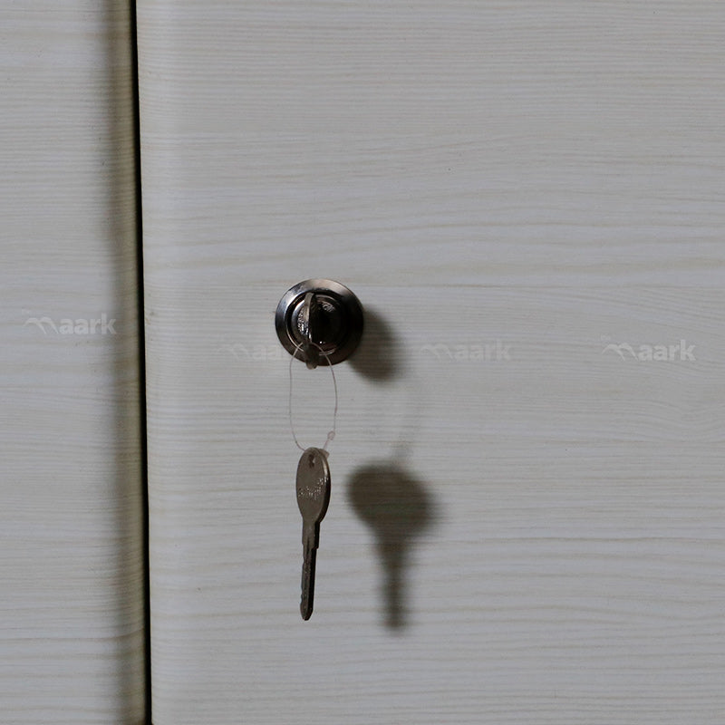 A built-in simulator, movable shelves, a door with a tower bolt for a safe lock, drawer storage inside the wardrobe, and a clothes rack line for hanging clothes are all additional characteristics of this wardrobe.
