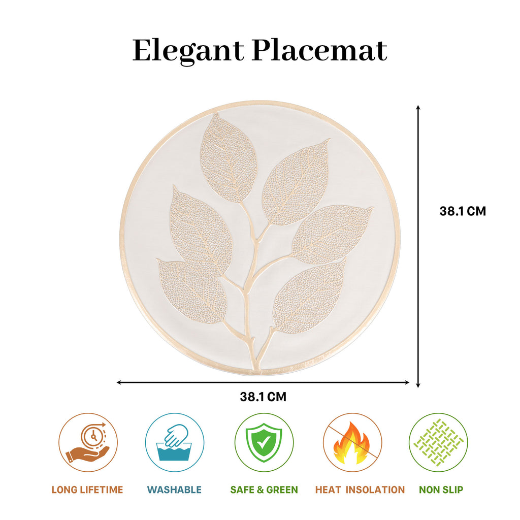 - This round placemat, which adds a rich and festive touch to your meals, is made from premium-quality waterproof PVC material and has a gorgeous gold base with delicate silver leaf patterns.