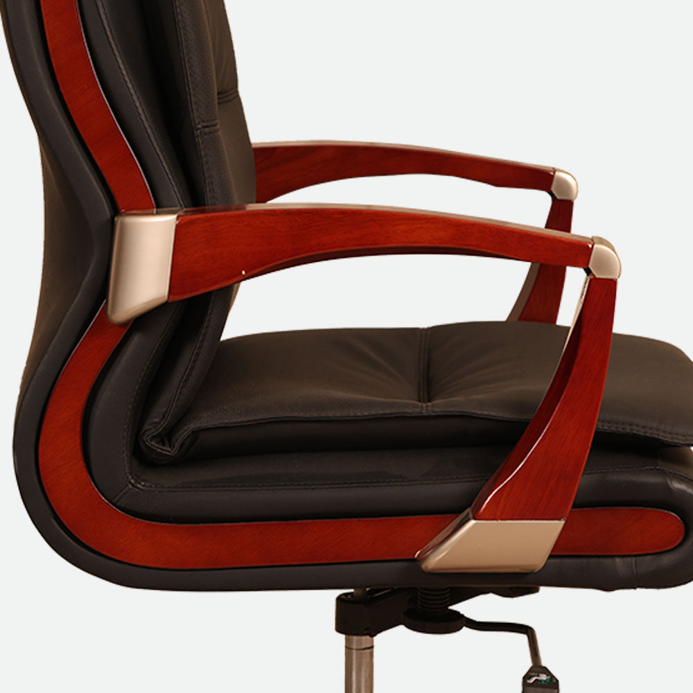 - This chair, which is cushioned in leatherette or high-end black cloth, adds a polished and polished appearance to any workstation.