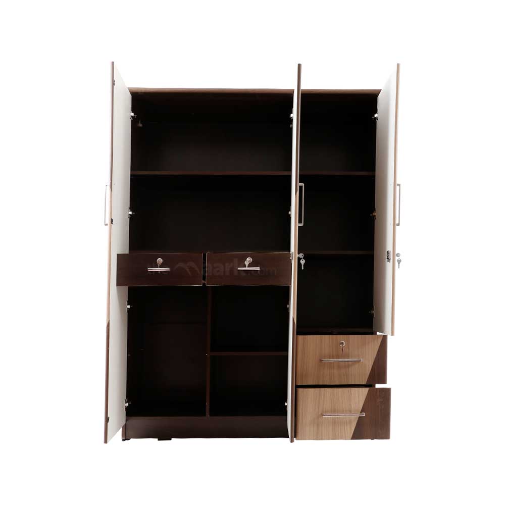 A built-in simulator, movable shelves, a door with a tower bolt for a safe lock, drawer storage inside the wardrobe, and a clothes rack line for hanging clothes are all additional characteristics of this wardrobe.