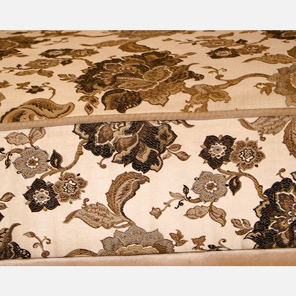 * Classic living room of the Palace collection in gold fabric version, composed of sofa and armchair with details in carved Teak wood.