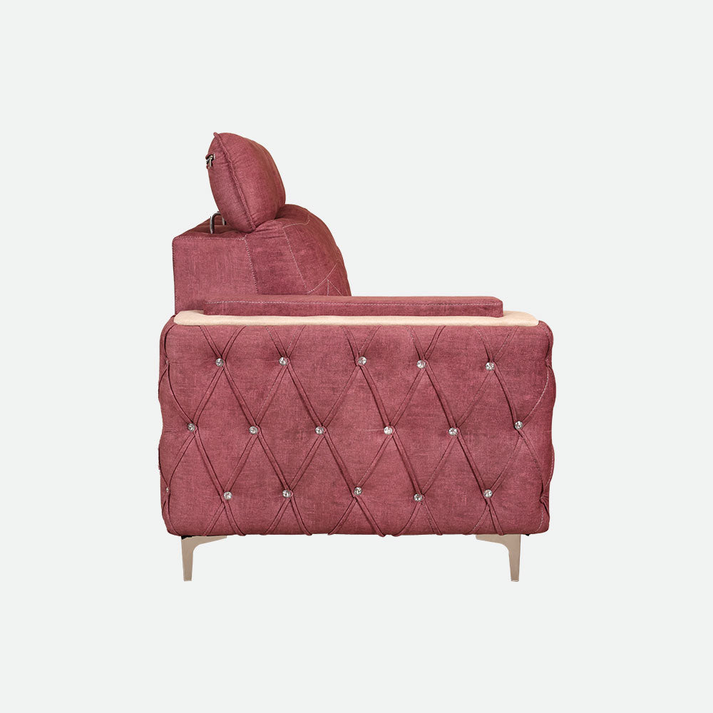 - This sofa, which has a comfortable cushioned backrest, supporting armrests, and ample seating for family and guests, is designed with a chic maroon fabric.