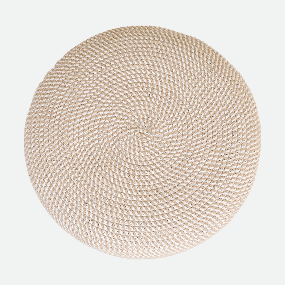 - This round ottoman adds comfort and style to any space with its smooth knitted surface and calming beige color.
