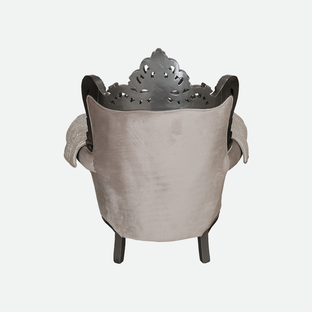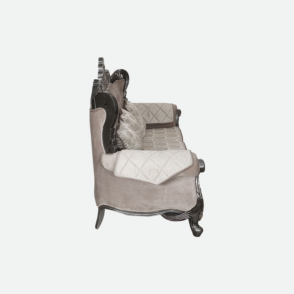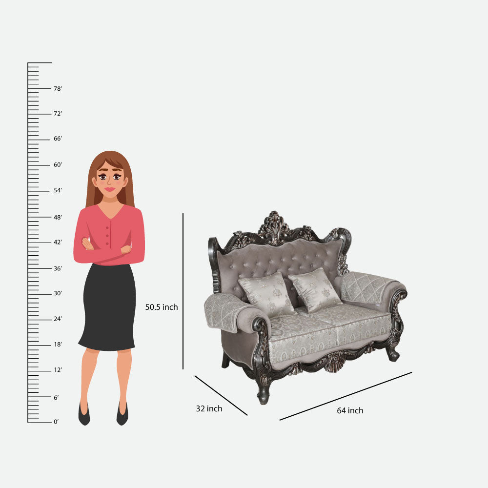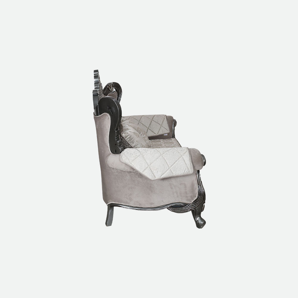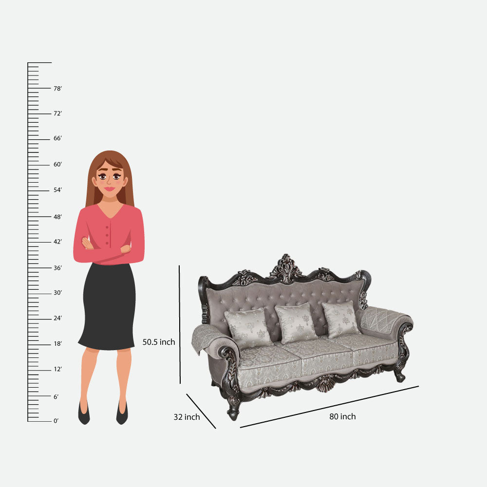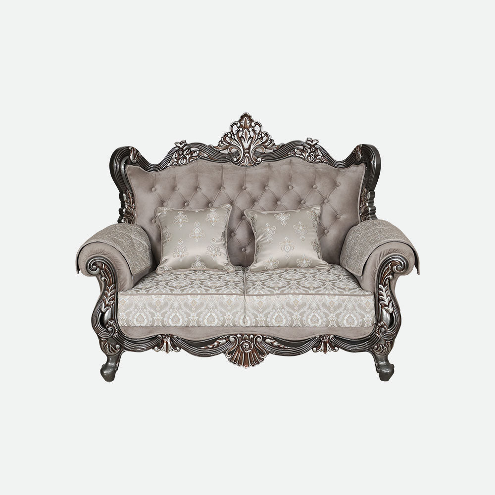 - This sofa set combines classic grandeur with contemporary luxury, including silver-grey details, regal hand-carved decorations, and superior velvet fabric.