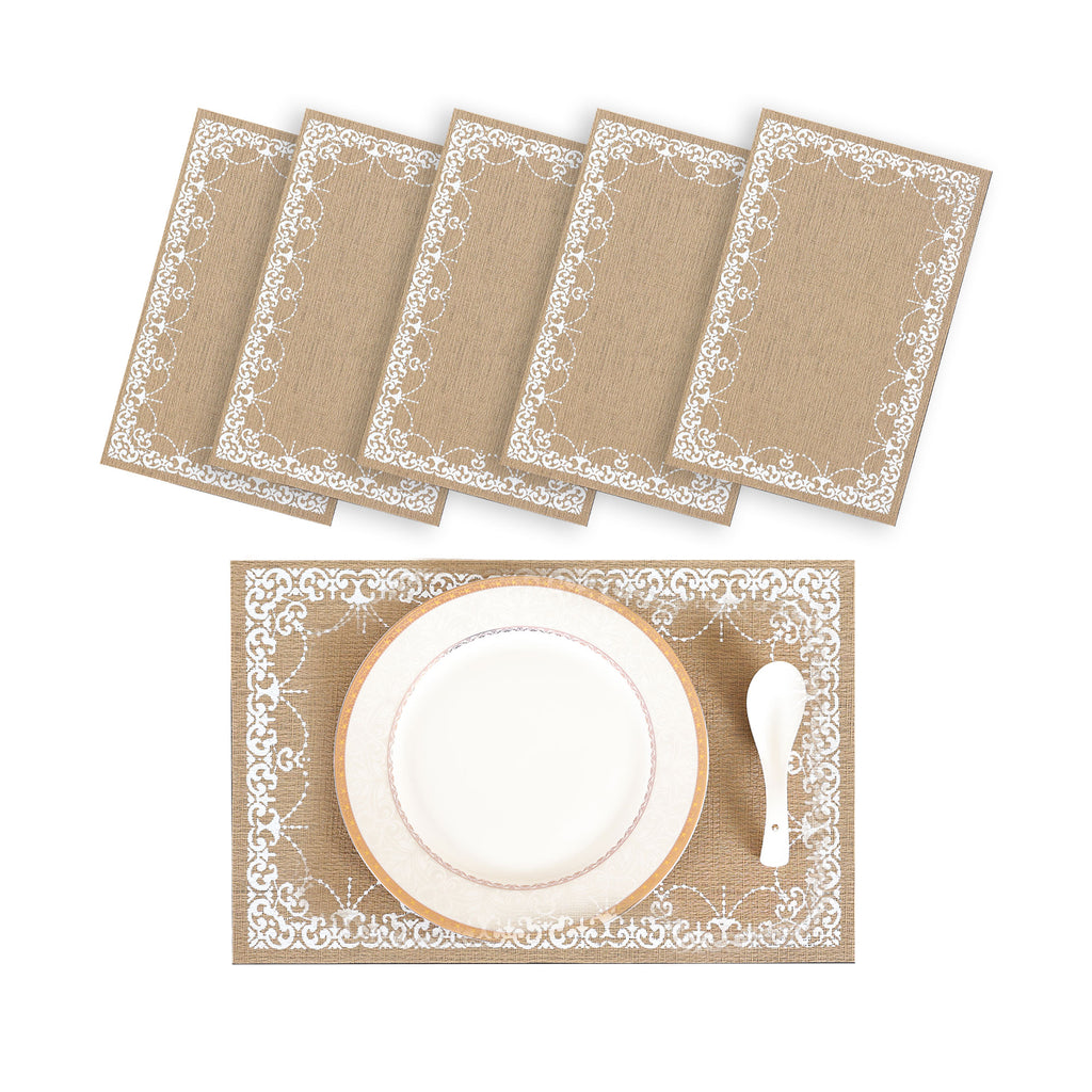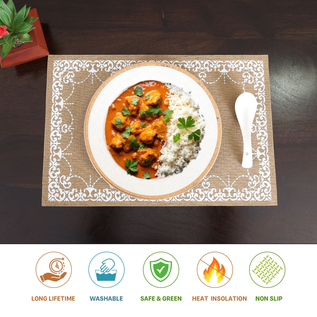 - Crafted from premium-quality PVC material, this placemat is heat-resistant, durable, lightweight, and easy to clean.